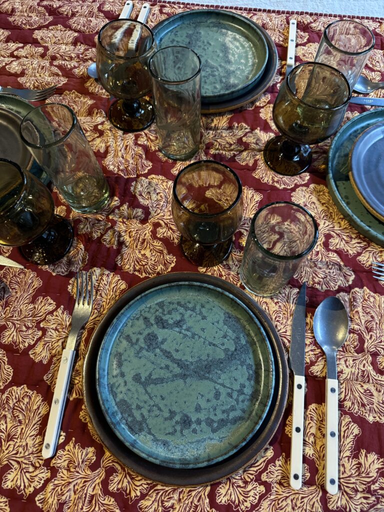 BW: I always start with the foundation—the linens. A beautiful tablecloth, napkins, or a set of placemats establishes the mood and grounds everything else. From there, I think about layering in pieces with history and patina—things like my grandmother’s gold-rimmed glasses, serving dishes collected during past travels—these bring warmth and a sense of continuity to the table. I love mixing these heirloom pieces with newer artisan-made items; that combination of age and contemporary craft keeps things from feeling too serious.