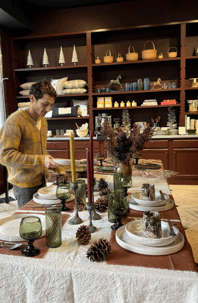 The holidays have a way of pulling us back to the things that feel most elemental—craft, memory, ritual, and the quiet beauty of objects made by hand. For Artisans & Co-Owner and interior designer Brooks William, the season isn’t about spectacle or trend; it’s a return to the soulful details that make a home feel lived-in and loved. William’s approach to holiday decorating begins with a story: the patina of a grandmother’s gold-rimmed glasses, the weight of hand-thrown ceramics, foraged leaves collected on walks that become impromptu placemats, etc. In William’s world, a table isn’t staged, it’s a layered, personal, and deeply felt place where craft and comfort intertwine to welcome people in.